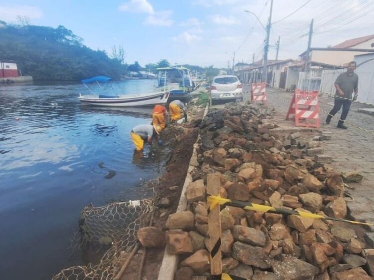 Já na Boca da Barra, as equipes de serviços públicos realizaram a recuperação de um muro de gabião, que são estruturas de malha metálica preenchidas com pedras, que servem para estabilizar a margem do rio, controlando o processo de erosão.