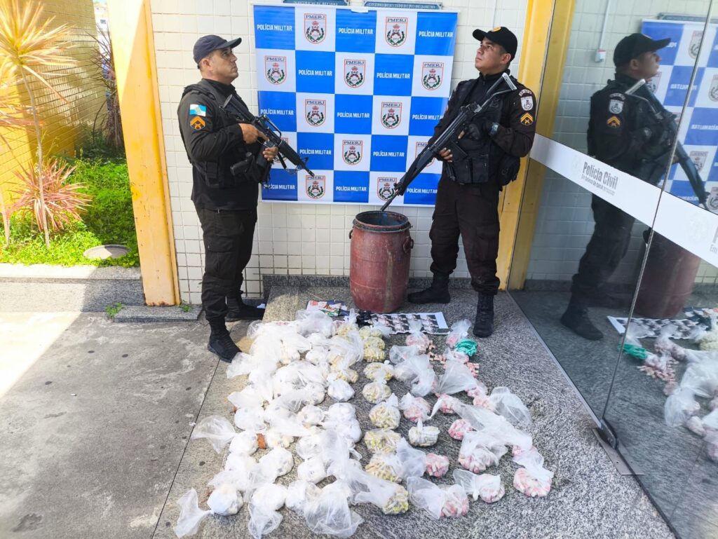 Durante buscas na localidade, os policiais conseguiram encontrar o tonel que continha 1.902 pinos de cocaína de diferentes valores, além de material para endolação e duas balanças de precisão, usadas pelo tráfico para preparar as drogas para venda.