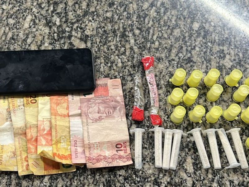 Ao chegarem ao local, os policiais teriam encontrado 5 pessoas em atitude suspeita debaixo de uma cobertura, encontrando com eles 35 pinos de cocaína, 2 papelotes de maconha, 1 celular e mais 140 reais em dinheiro.