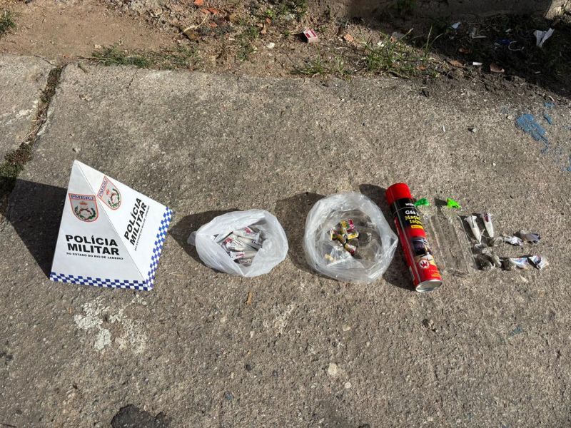 Segundo a PM, as drogas, que não tiveram a quantidade divulgada e incluíam crack, cocaína e maconha, foram encontradas, juntamente com 196 reais em dinheiro e 1 telefone celular, escondidas em sacolas sobre um muro de tijolos e dentro de um medidor de luz de uma casa.
