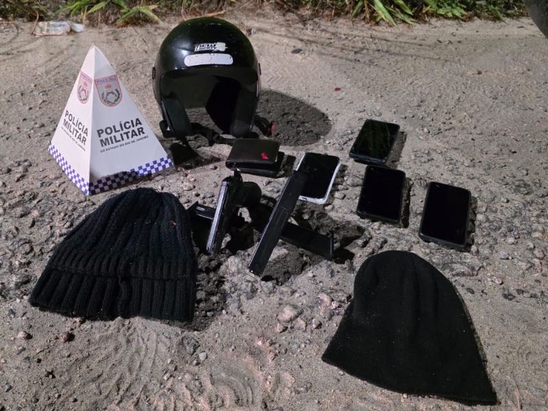 Ao averiguar o carro, os policiais encontraram uma pistola calibre .380 com 7 munições, um simulacro de arma de fogo, duas toucas e um capacete, além de telefones celulares e dinheiro em espécie.