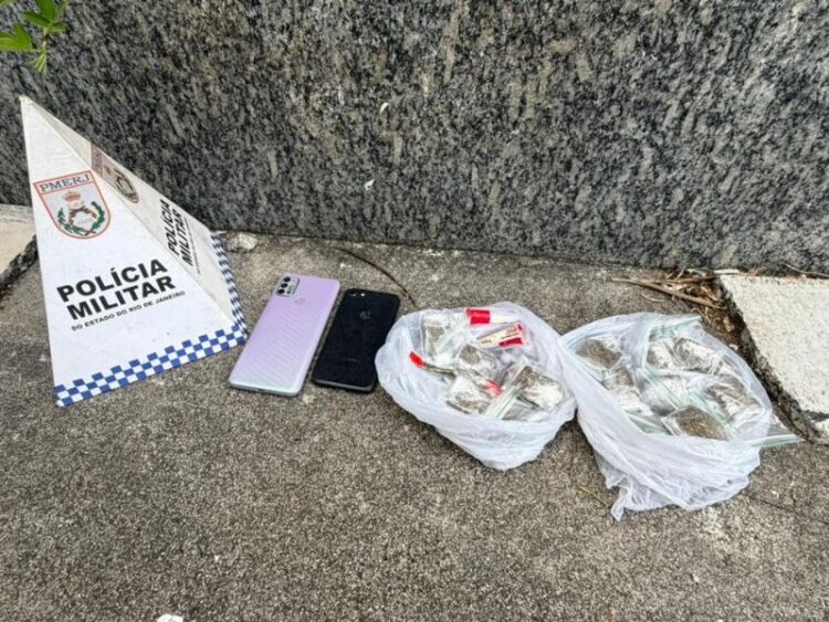 Após buscas no hidrômetro e em um local próximo a um pinheiro, os agentes apreenderam 21 sacolés de maconha e 3 tubos plásticos de cocaína, somando 154,2 gramas de drogas, além de 3 telefones celulares e uma chave de motocicleta.