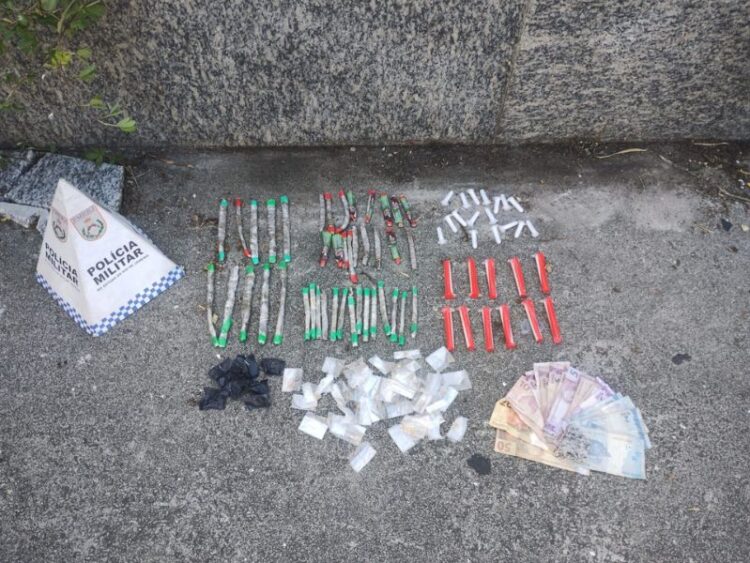 Durante a ação, os agentes encontraram maconha, cocaína e crack, além de dinheiro, em quantidades não divulgadas pela PM, que apreendeu os materiais e os levou para a 128ª Delegacia de Polícia Civil (128ª DP), de Rio das Ostras, juntamente com o traficante.